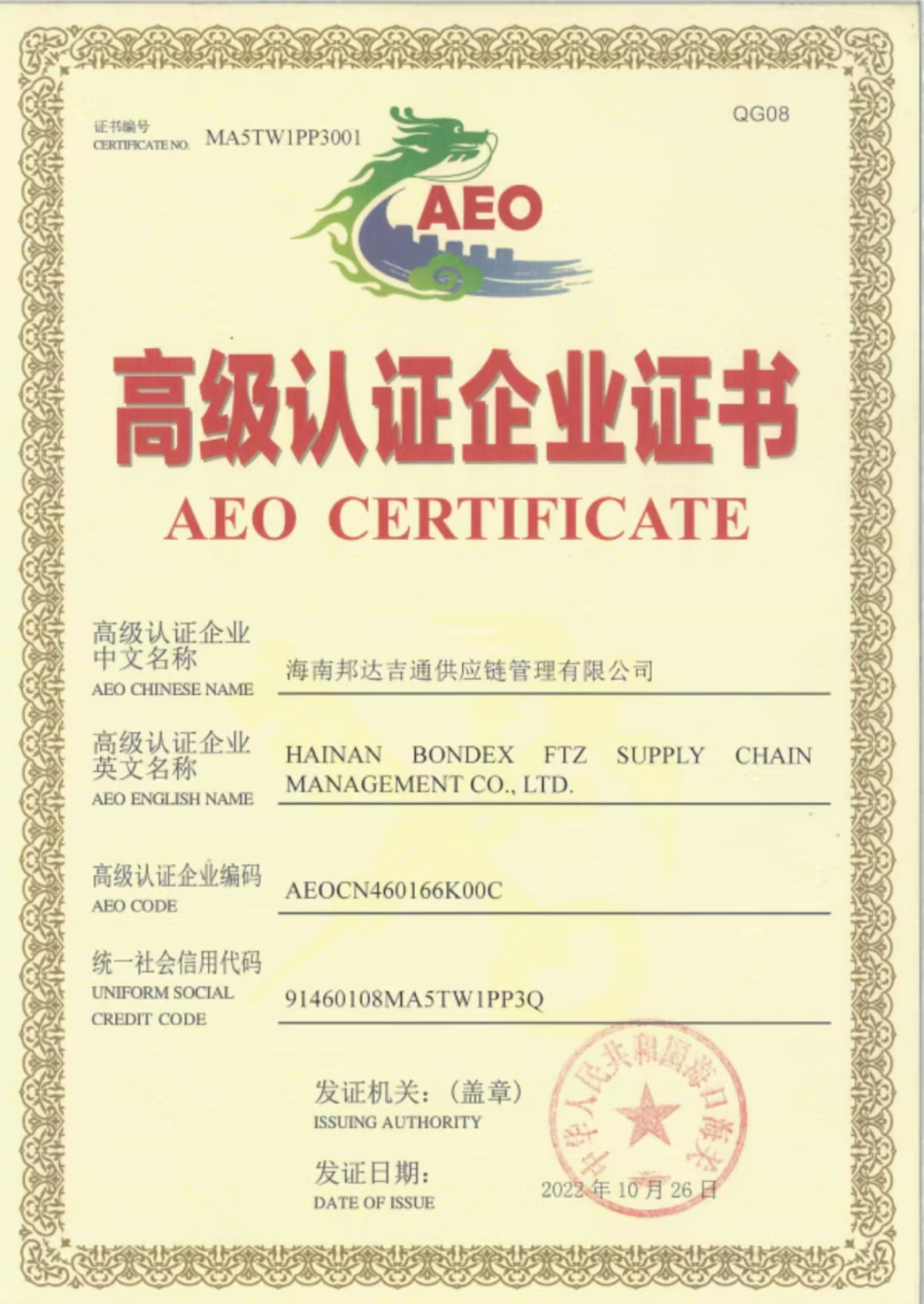 On October 26, 2022, Haikou Customs issued Hainan Bondex FTZ Supply Chain Management Co., Ltd. (the Company) with the Advanced "AEO CERTIFICATE".