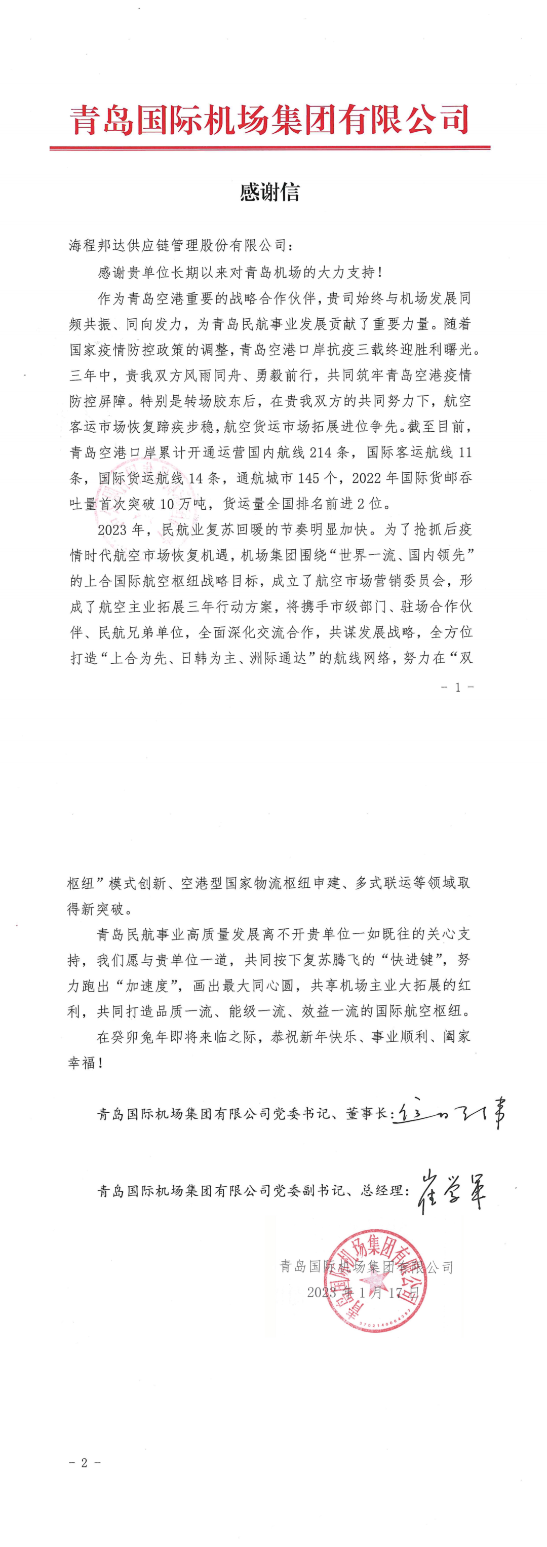 At the time of ringing out the old year and ringing in the new, Bondex received a letter of thanks from Qingdao Airport. This letter expresses the recognition and affirmation of our professional and efficient services and fully encourages Bondex and Qingdao Airport to cooperate sincerely and make progress together. It is the unremitting motivation for us to move forward despite all difficulties.