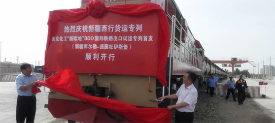 2015年7月29日,由海程邦達組織開行的新疆——德國杜伊斯堡罐式集裝箱班列正式開行。將這種罐裝化工品采用鐵路運輸?shù)綒W洲的方式在我國尚屬首次,相比海運,鐵路運輸?shù)降聡臅r間僅僅需要20天左右,極大地滿足了客戶需求。華鐵聯(lián)達負責協(xié)調沿途的哈薩克斯坦、白俄羅斯、俄羅斯、波蘭和德國的鐵路運輸部門,負責辦理此類化工品的證書以及中途換裝,目前已經有流暢的操作流程,這也是目前公司鐵運部門比較凸顯的優(yōu)勢。這趟班列的正式開行為公司鐵路運輸業(yè)務的發(fā)展錦上添花。