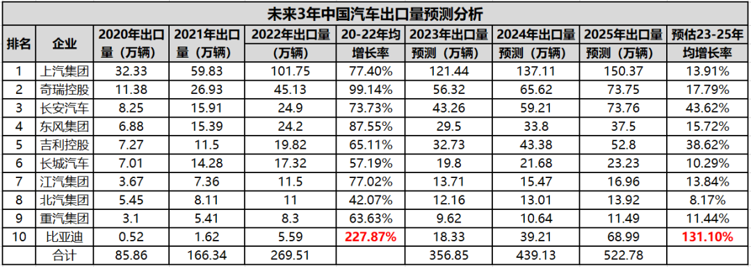 中國國產(chǎn)汽車充分發(fā)揮體系化、規(guī)?;膬?yōu)勢,不斷豐富海外產(chǎn)品矩陣,產(chǎn)品力和品牌力持續(xù)上升。依照日系車企歷史趨勢,結(jié)合中國歷史增速變動,預估2025 年國產(chǎn)車海外銷售占比有望提升至 20%,2023-2025年分別為 379/461/550 萬輛,以下是國內(nèi)主要汽車企業(yè)未來三年出口量預估數(shù)據(jù)。