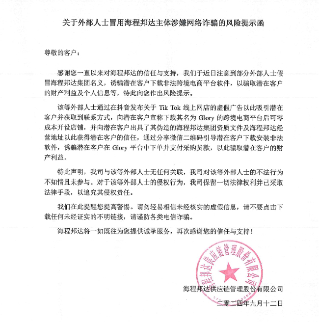 關(guān)于外部人士冒用海程邦達(dá)主體涉嫌網(wǎng)絡(luò)詐騙的風(fēng)險(xiǎn)提示函